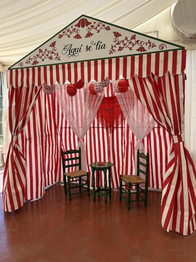 Cada detalle ha sido cuidadosamente seleccionado para transportarte a una auténtica caseta sevillana: el aroma del albero, el sonido de las sevillanas y la calidez de una decoración hecha a mano que refleja la verdadera magia de la Feria.